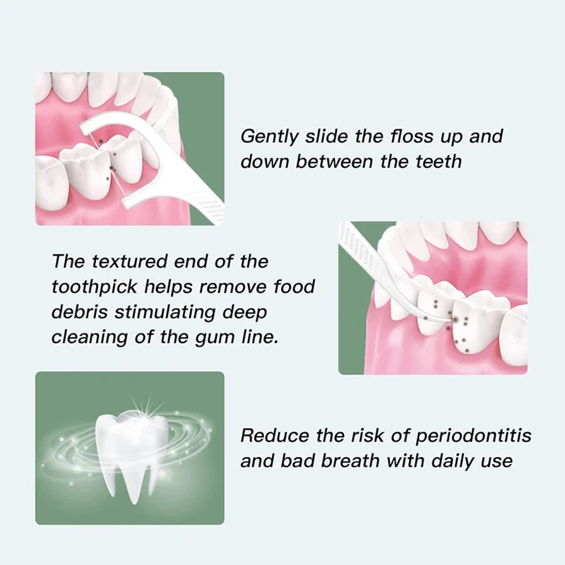 3. Ultra-thin and comfortable flosses that can slide smoothly between tight teeth, natural and durable flosses, the flosses is a round flosses that won't hurt your gums and won't get stuck in your teeth.